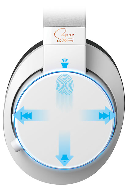 Adjust your volume levels by simply sliding a finger vertically on the SXFI AIR’s left ear-cup. Tap the ear-cup to Pause/Play, or slide Left and Right on the ear-cup to switch track. You’re in control.